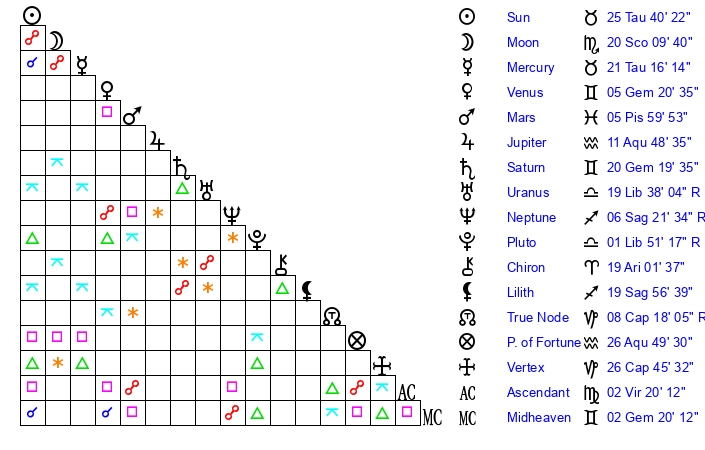 Saturn | 20 Gemini 36 | 29 Pisces 13 | 27 Gemini 16 |
