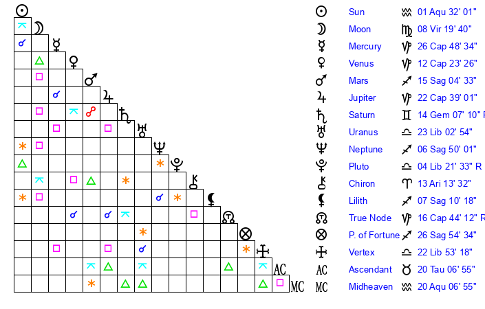 Sun | 1 Aquarius 31 | 1 Aquarius 54 | 23 Pisces 58 |