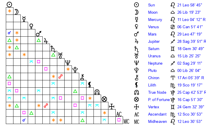 Sun | 21 Leo 58 | 22 Leo 9 | 13 Libra 32 |