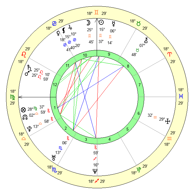 | Moon | 25 Gemini 40 | 25 Libra 21 | 20 Pisces 11 |