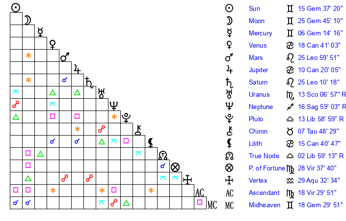 | Sun | 15 Gemini 37 | 16 Gemini 14 | 0 Leo 29 |