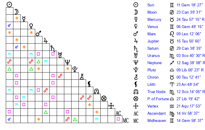 | Sun | 11 Gemini 18 | 11 Gemini 27 | 28 Cancer 4 |