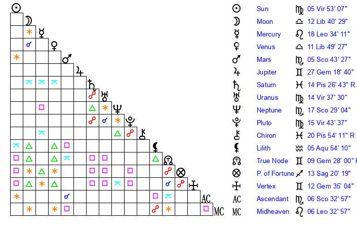 Pluto | 15 Virgo 44 | 1 Aquarius 48 | 17 Virgo 44 |