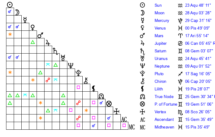 Sun | 23 Aquarius 48 | 24 Aquarius 14 | 16 Pisces 57 |