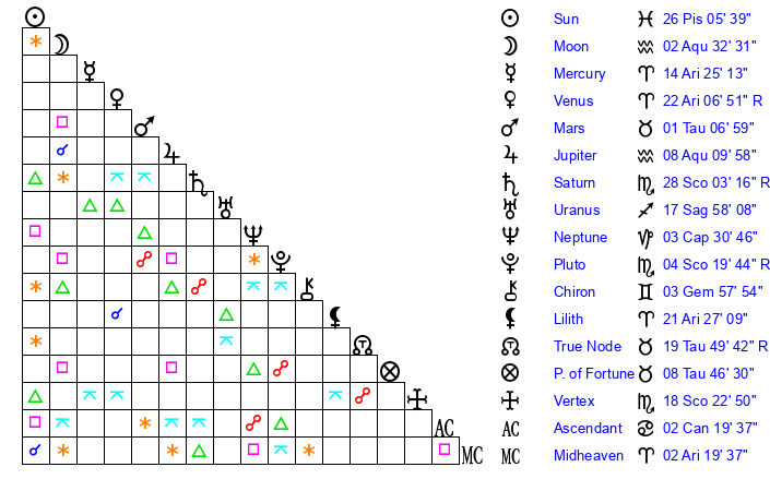 | Sun | 26 Pisces 6 | 26 Pisces 24 | 5 Taurus 28 |