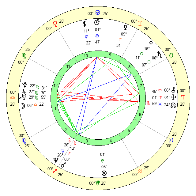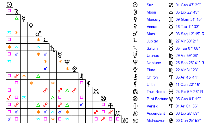Moon | 6 Libra 16 | 4 Gemini 58 | 25 Libra 41 |