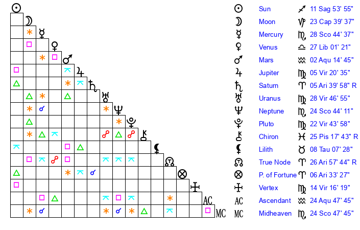 Sun | 11 Sagittarius 54 | 13 Sagittarius 5 | 9 Aquarius 55 |