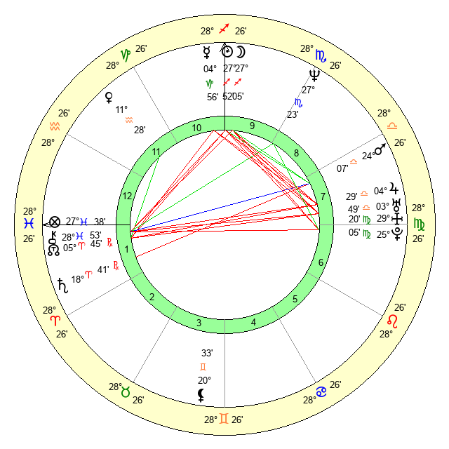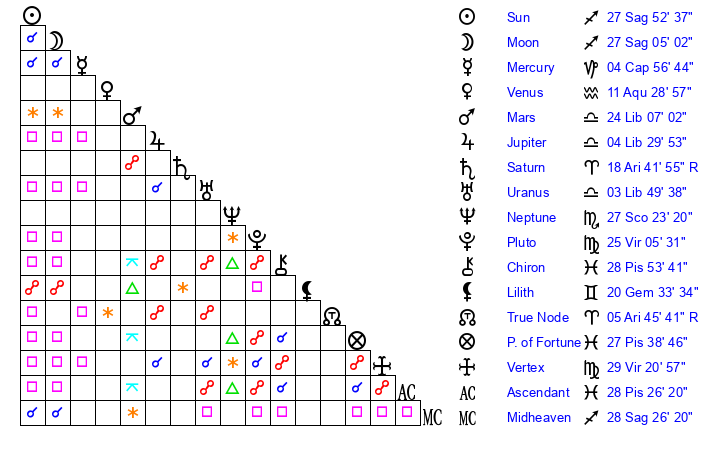 Neptune | 27 Scorpio 23 | 27 Pisces 10 | 28 Scorpio 39 |