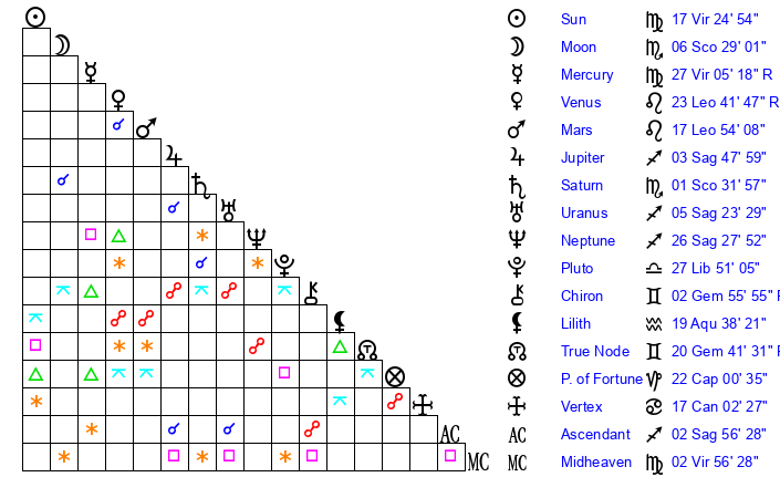 | Mercury | 27 Virgo 5 | 15 Virgo 44 | 23 Libra 20 |