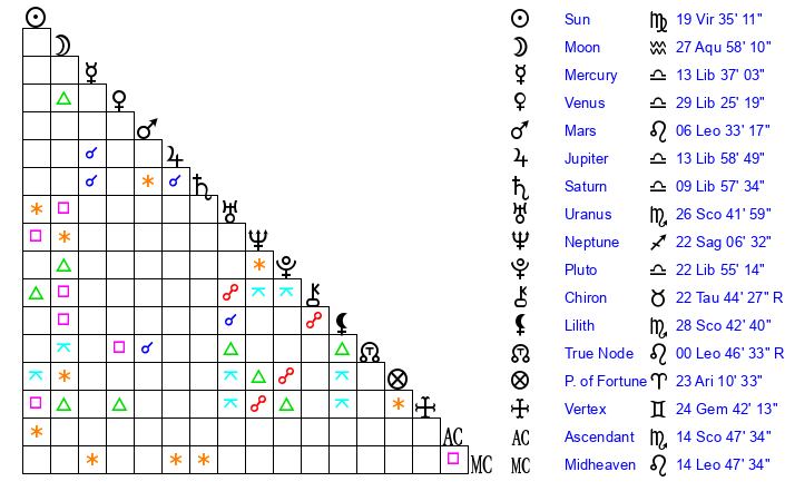 | Moon | 27 Aquarius 59 | 23 Taurus 25 | 17 Libra 24 |