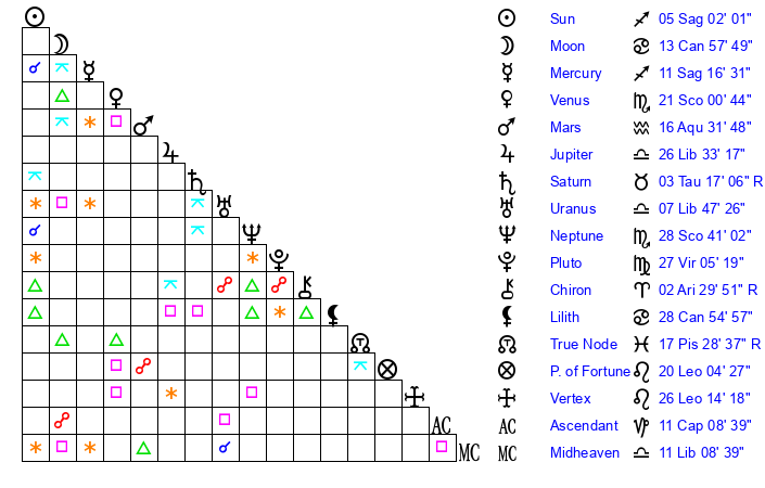 Sun | 5 Sagittarius 2 | 5 Sagittarius 42 | 1 Aquarius 0 |