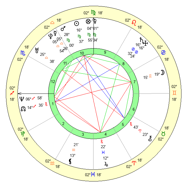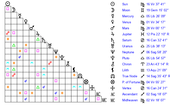 | Sun | 16 Virgo 37 | 17 Virgo 16 | 6 Scorpio 53 |