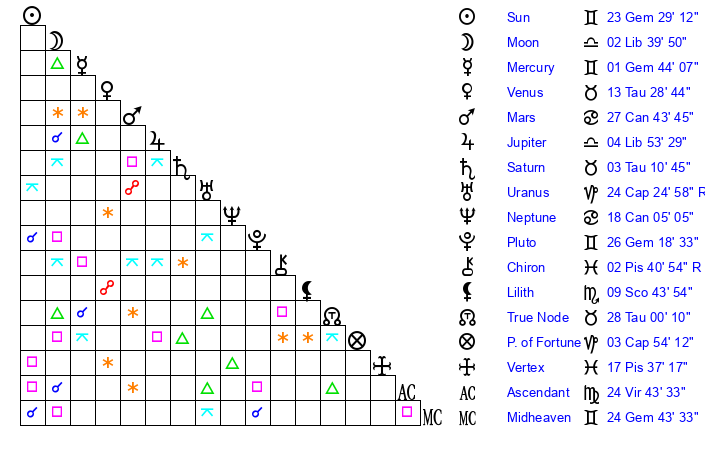 | Pluto | 25 Gemini 35 | 2 Aquarius 44 | 25 Gemini 16 |