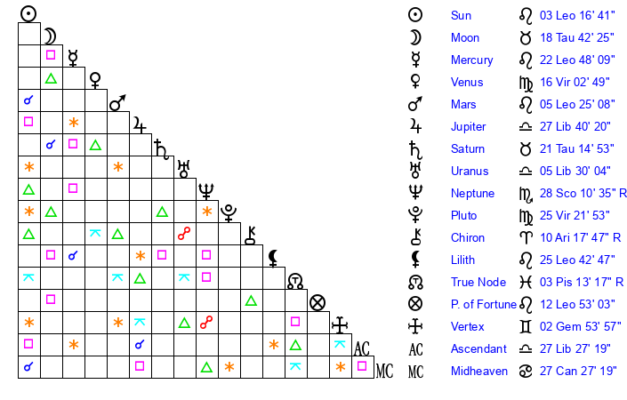 Moon | 18 Taurus 43 | 27 Leo 48 | 23 Taurus 49 |