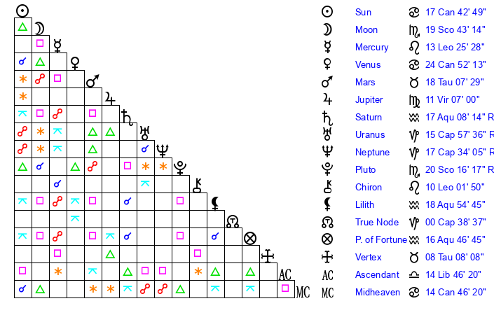 Moon | 19 Scorpio 44 | 4 Capricorn 16 | 0 Aquarius 23 |