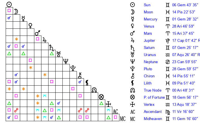 | Moon | 14 Pisces 18 | 29 Gemini 42 | 17 Aries 50 |