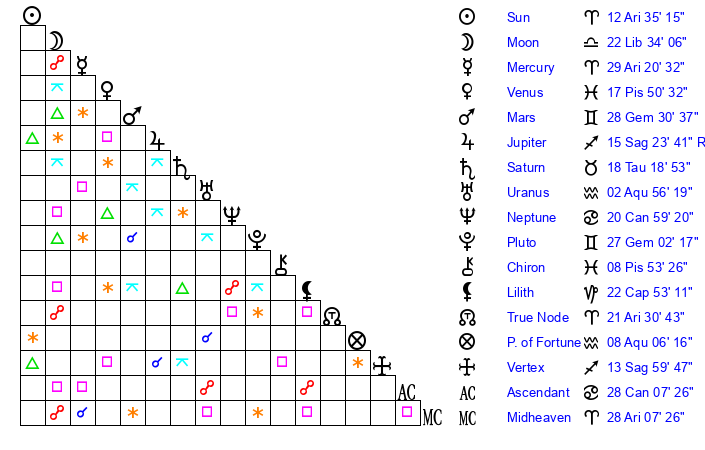 | Sun | 12 Aries 35 | 13 Aries 12 | 1 Leo 23 |