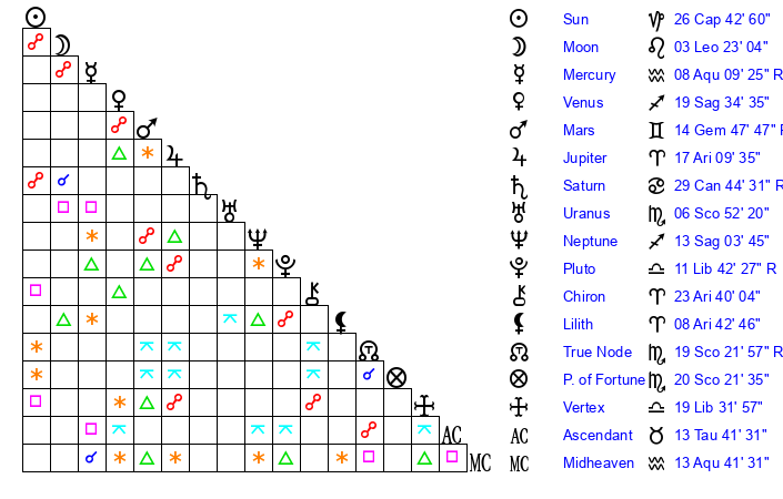 | Neptune | 13 Sagittarius 3 | 27 Pisces 36 | 13 Sagittarius 56 |
