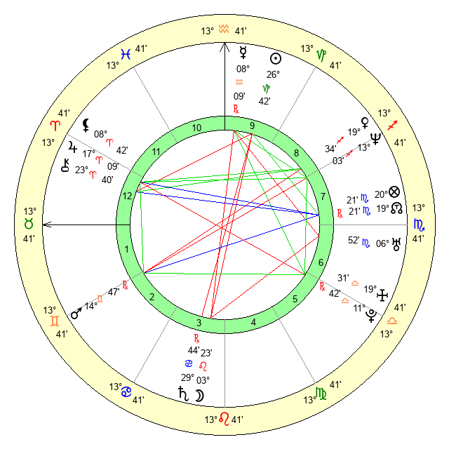 | Moon | 3 Leo 18 | 12 Virgo 30 | 18 Taurus 28 |
