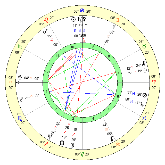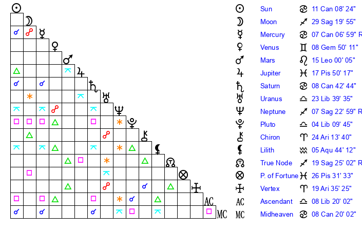 | Sun | 11 Cancer 8 | 11 Cancer 46 | 29 Leo 56 |