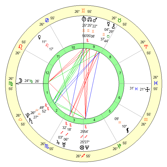 | Moon | 24 Virgo 32 | 12 Pisces 43 | 27 Pisces 46 |