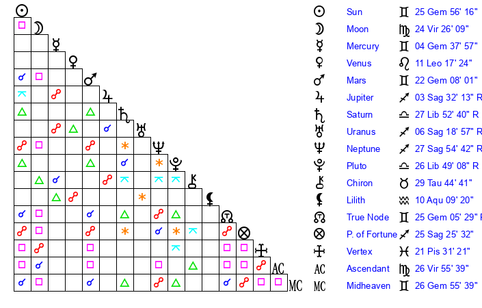 | Moon | 24 Virgo 32 | 12 Pisces 43 | 27 Pisces 46 |