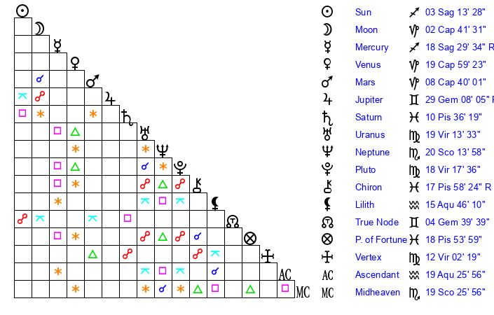 Pluto | 18 Virgo 18 | 0 Aquarius 6 | 18 Virgo 11 |