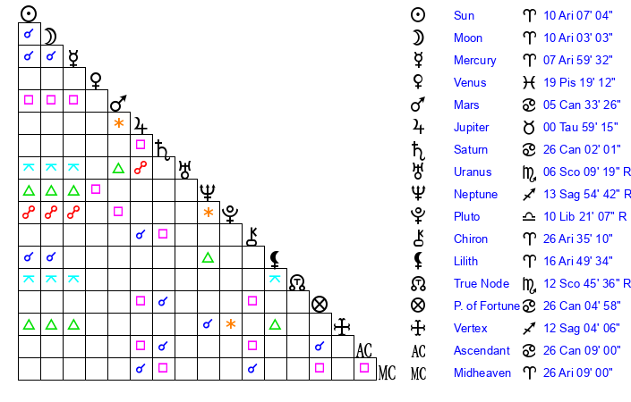 | Moon | 9 Aries 58 | 27 Aries 55 | 2 Aquarius 14 |