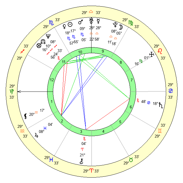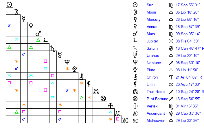 | Moon | 5 Libra 16 | 7 Pisces 40 | 29 Cancer 45 |