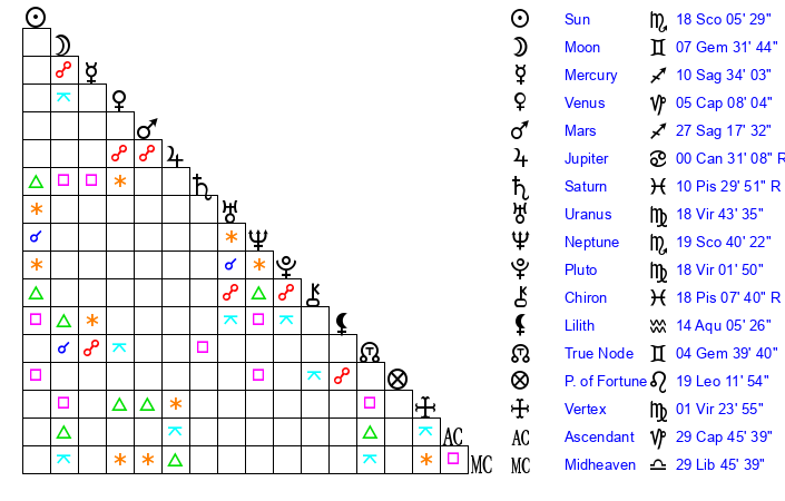 Sun | 18 Scorpio 6 | 18 Scorpio 48 | 17 Capricorn 59 |