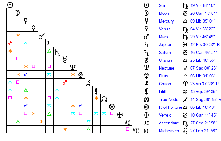 | Sun | 19 Virgo 18 | 19 Virgo 56 | 9 Scorpio 38 |