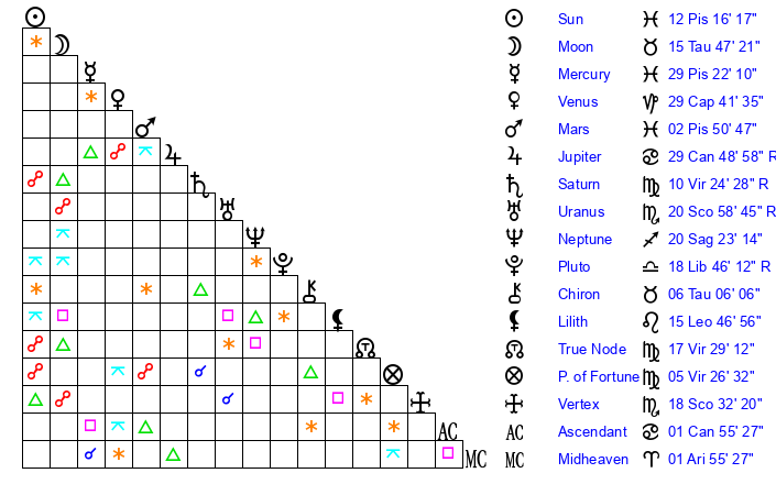 | Sun | 12 Pisces 16 | 13 Pisces 7 | 27 Aries 49 |