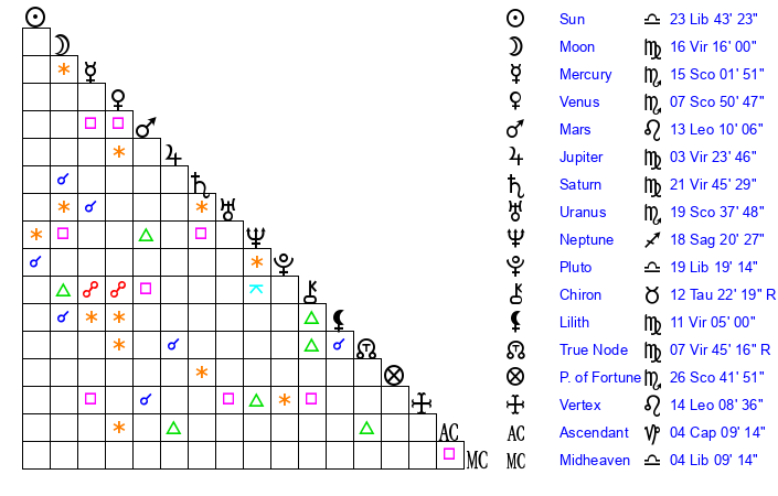 | Saturn | 22 Virgo 7 | 26 Pisces 28 | 26 Virgo 17 |