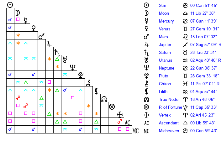 | Moon | 11 Libra 33 | 23 Taurus 52 | 29 Scorpio 54 |
