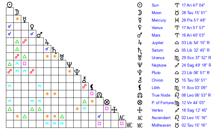 | Moon | 28 Taurus 13 | 19 Leo 20 | 0 Capricorn 22 |