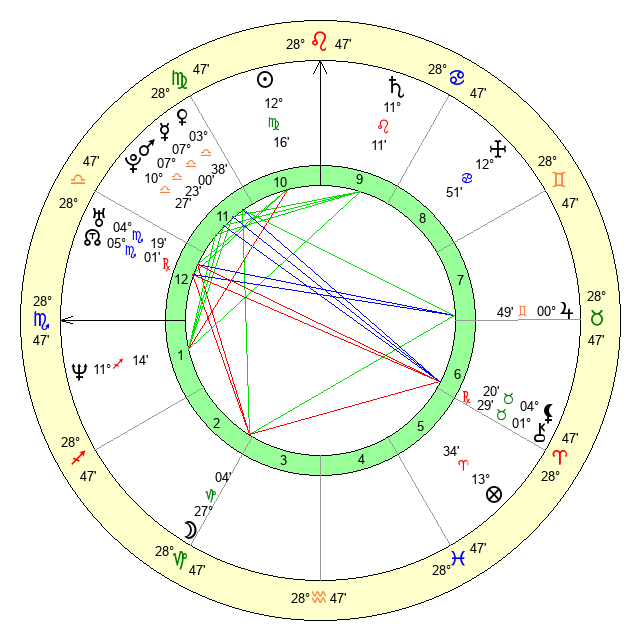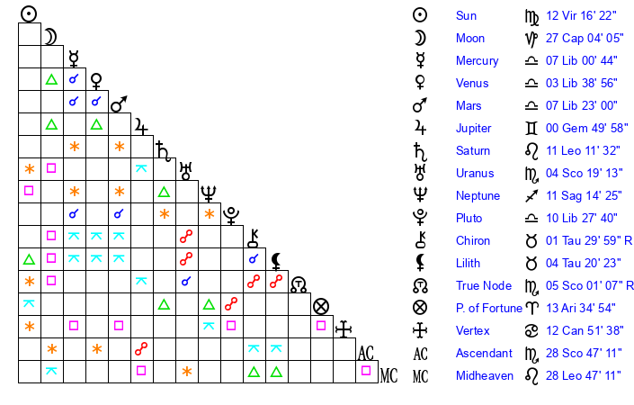 | Sun | 12 Virgo 16 | 12 Virgo 25 | 0 Scorpio 25 |