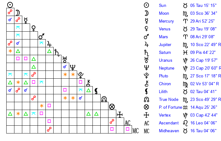 Pluto | 27 Scorpio 16 | 3 Aquarius 47 | 26 Scorpio 26 |