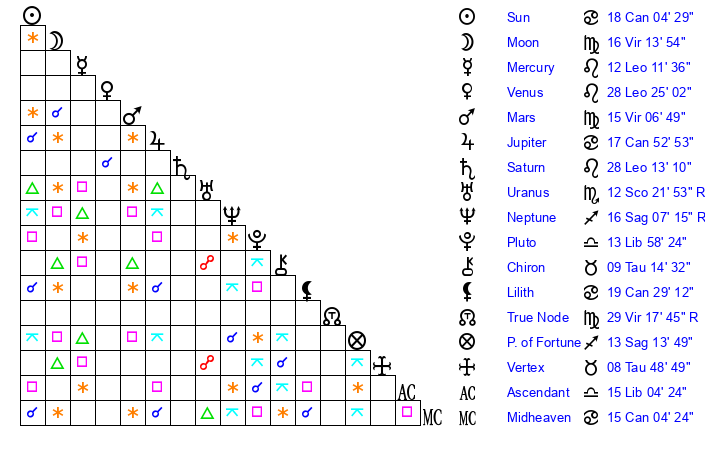 | Moon | 16 Virgo 14 | 16 Capricorn 59 | 16 Gemini 36 |