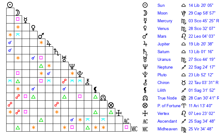 | Moon | 29 Capricorn 59 | 22 Aries 13 | 22 Virgo 55 |