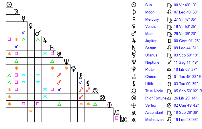 | Moon | 7 Leo 37 | 6 Virgo 7 | 26 Taurus 26 |