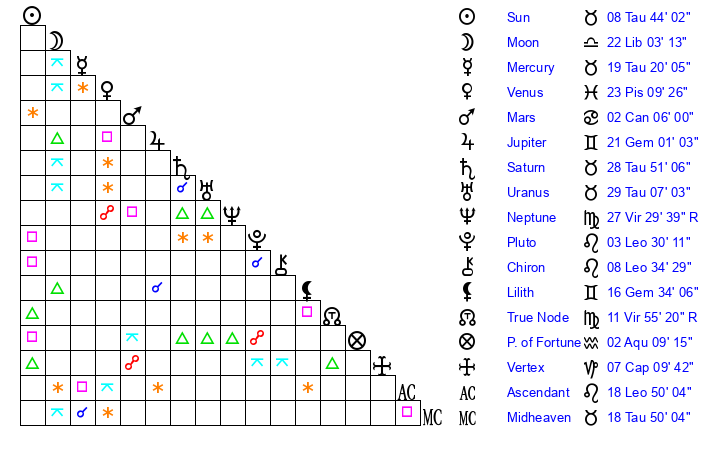 | Saturn | 29 Taurus 5 | 27 Pisces 37 | 9 Gemini 13 |