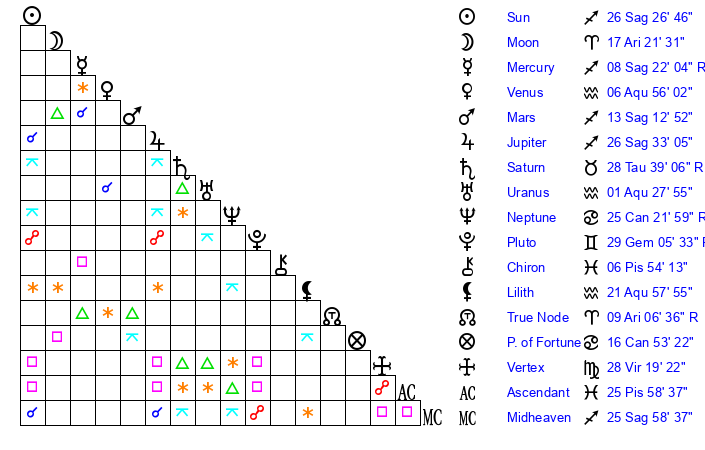 | Moon | 17 Aries 22 | 12 Sagittarius 4 | 6 Gemini 16 |