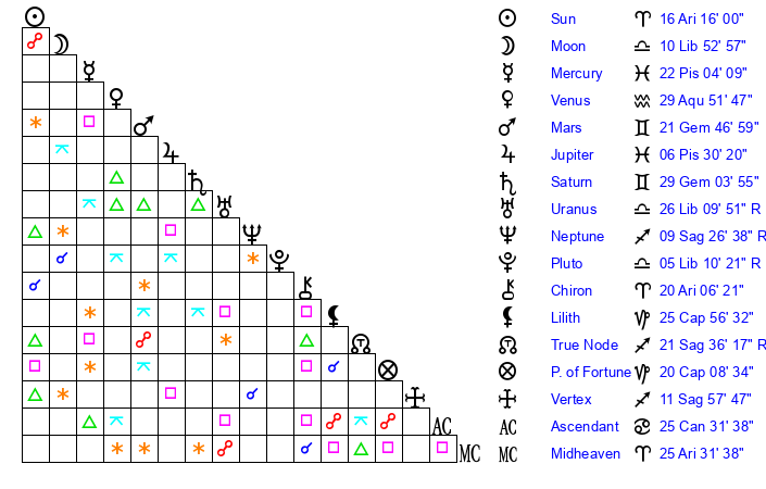 | Sun | 16 Aries 15 | 16 Aries 54 | 5 Gemini 46 |