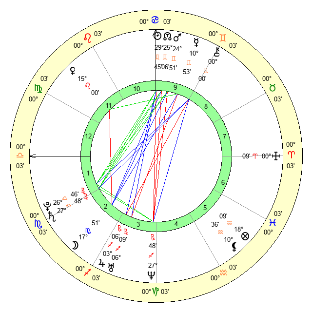 | Sun | 29 Gemini 45 | 0 Cancer 34 | 9 Leo 50 |