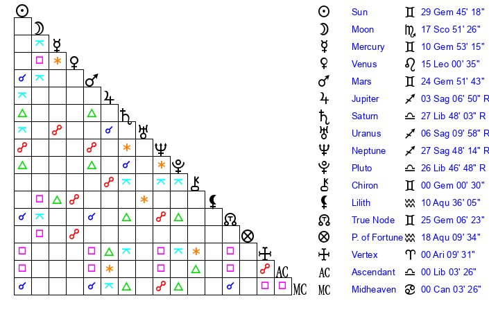 | Mercury | 10 Gemini 54 | 22 Cancer 46 | 1 Virgo 59 |