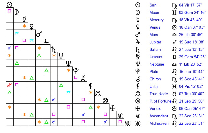 | Sun | 4 Virgo 18 | 4 Virgo 40 | 20 Scorpio 14 |