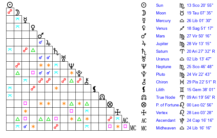 Pluto | 24 Virgo 23 | 29 Capricorn 46 | 25 Virgo 6 |