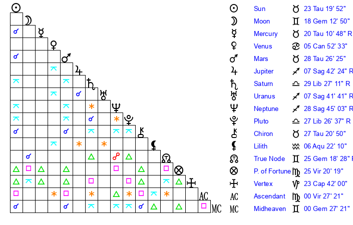 | Mercury | 20 Taurus 11 | 7 Taurus 22 | 17 Gemini 56 |