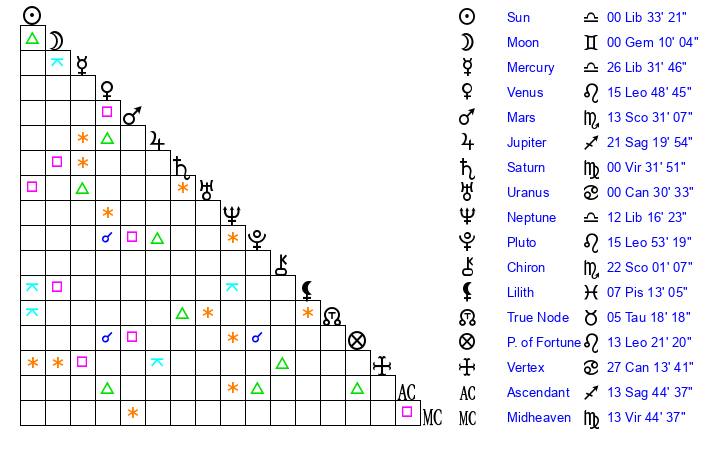 | Sun | 0 Libra 34 | 0 Libra 55 | 17 Sagittarius 33 |