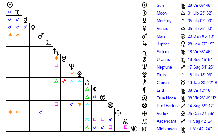 | Moon | 1 Libra 29 | 27 Virgo 27 | 15 Gemini 53 |